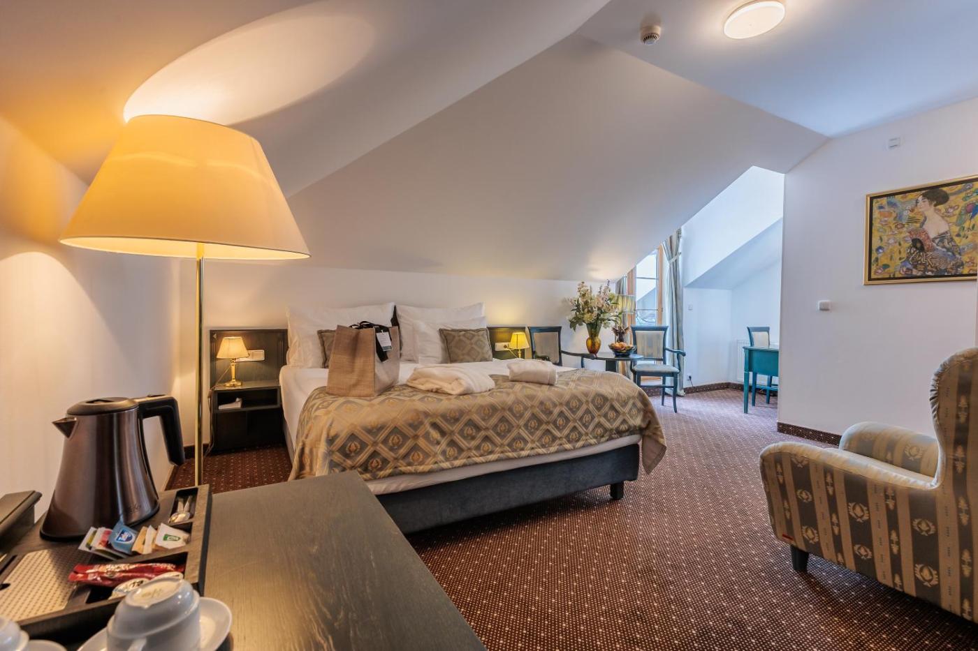 Dvoulůžkový pokoj Deluxe s manželskou postelí. Výhled do dvora nebo na golfové hřiště. Tyto velké pokoje s útulným posezením jsou vybaveny přistýlkou.