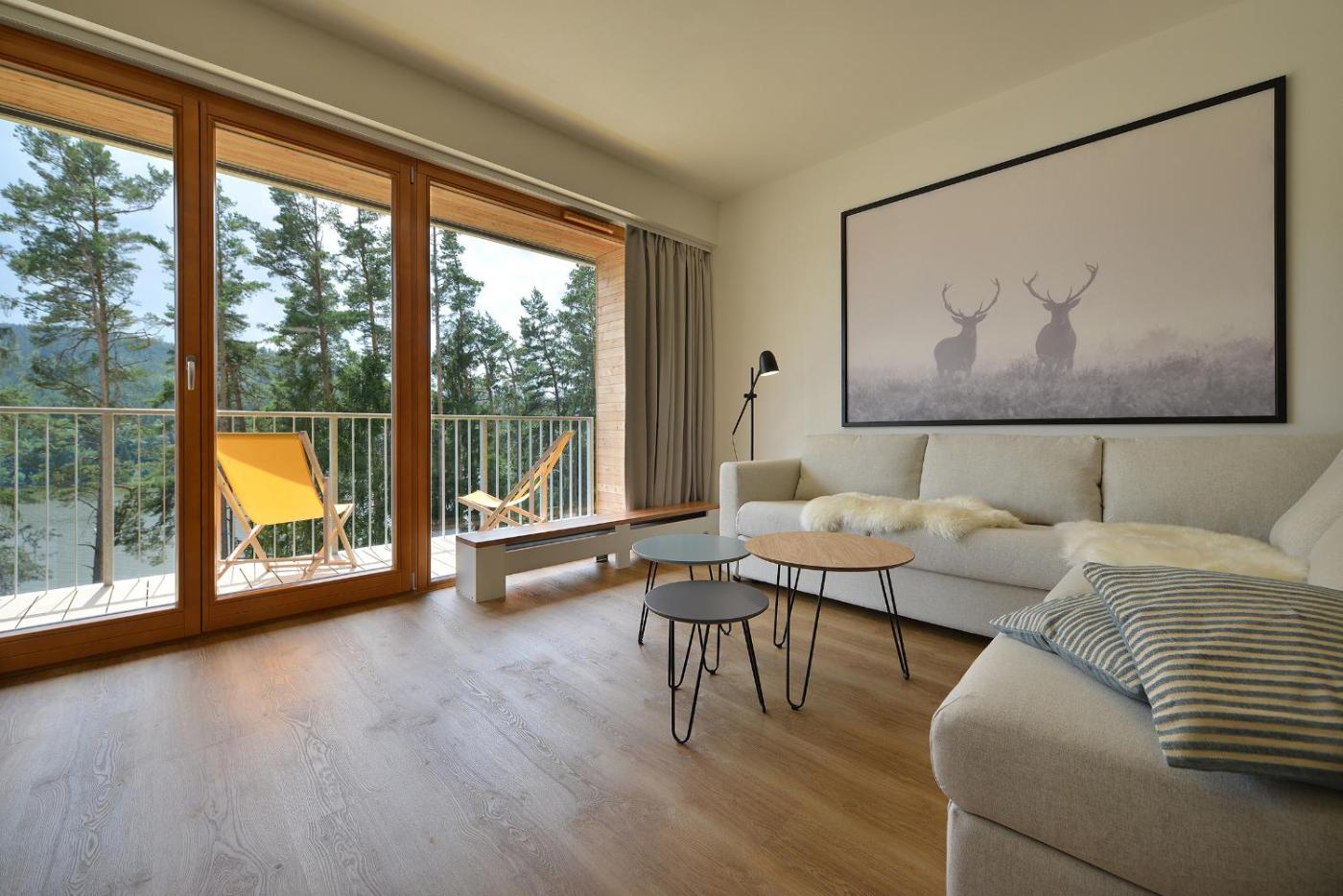 Apartmán typu Deluxe se 2 ložnicemi a saunou. Apartmán se saunou a dobře vybavenou kuchyní s lednicí, myčkou, nádobím a sporákem. Jedná se o prostorný apartmán se soukromým vchodem, zvukovou izolací, terasou s výhledem na jezero a vlastní koupelnou se sprchou. V ubytovací jednotce jsou 3 postele. ;