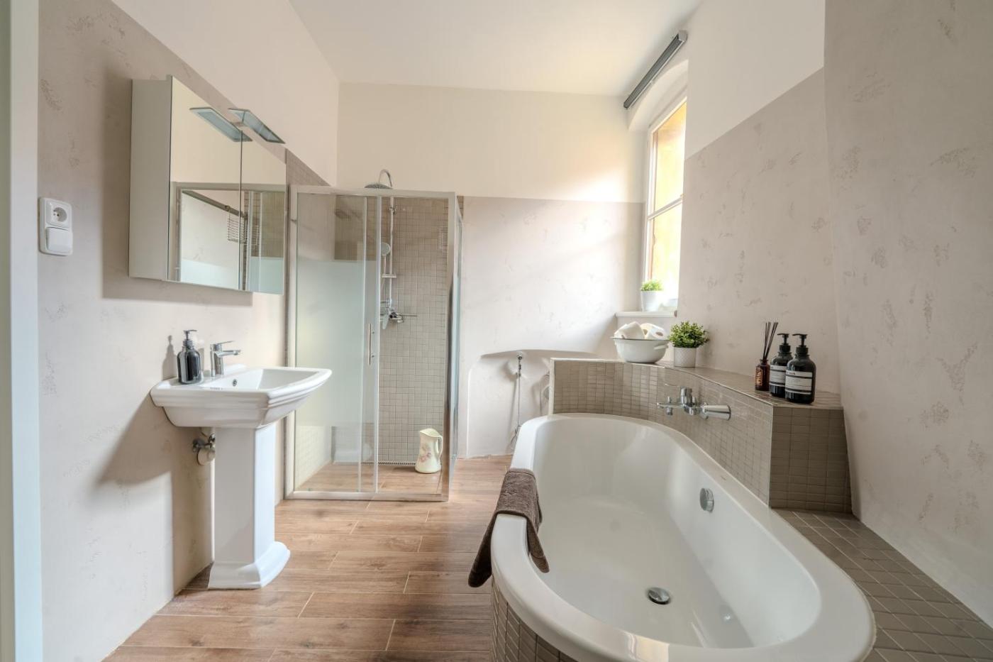 Apartmán s 1 ložnicí. This apartment is comprised of 1 living room, 1 separate bedroom and 2 bathrooms with a bath and free toiletries. In the well-fitted kitchen, guests will find a stovetop, a refrigerator, a dishwasher and kitchenware. The apartment offers a washing machine, soundproof walls, a tea and coffee maker, a flat-screen TV with streaming services, as well as city views. The unit offers 4 beds.