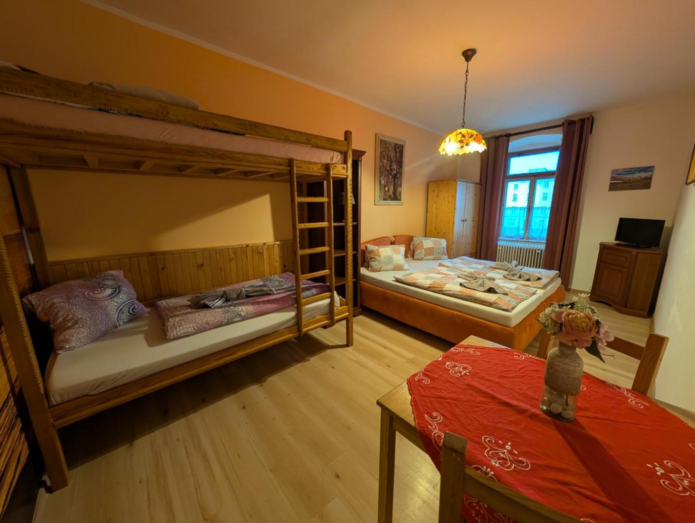 Rodinný pokoj. The family room provides a tea and coffee maker, a wardrobe, as well as a shared bathroom featuring a bath and a shower. Guests can make meals in the kitchen that comes with a refrigerator, a dishwasher, kitchenware and an oven. This family room features a high chair for children, heating, a flat-screen TV and city views. The unit offers 3 beds.